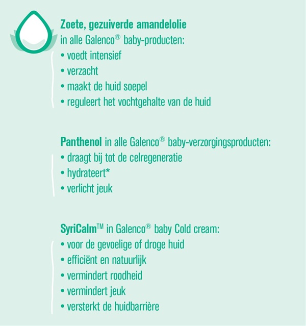 Galenco ® Baby biedt de mildste en veiligste producten om de huid van je baby te beschermen en te verzorgen. Alle formules zijn in de strengst mogelijke omgeving getest en voldoen aan de hoogste kwaliteitsnormen.